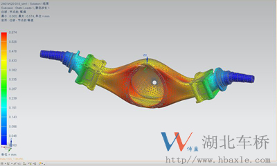 由上圖可知:當朝兩托板法向方向各施加力矩時,橋殼的最大位移0.574mm,滿足設計要求。